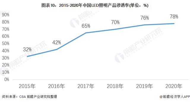 从我国LED照明产品渗透率来看,2015-2019年我国LED照明产品国内渗透率(LED照明产品销售数量/照明产品总销售数量)不断提高,2020年LED照明产品国内市场份额达到78%。较上年度提升了2%。说明我国LED照明产品的需求不断提高,在我国利好政策不断推出、配套产业链不断完善的情况下,预计未来我国LED照明需求将进一步扩大。